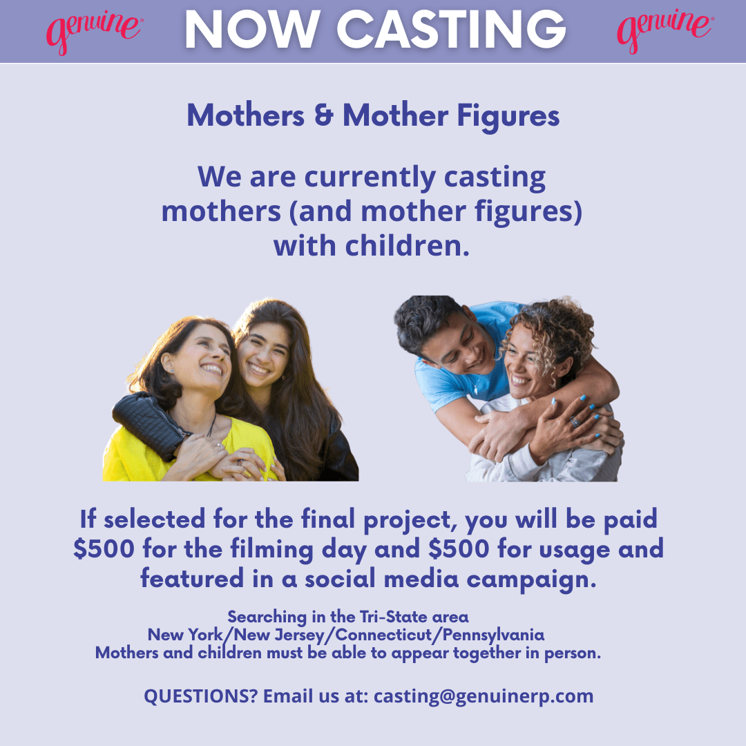 Location: Must be based in the Tri-State area (NY, NJ, CT, PA). Mothers and children must be able to appear together in person.